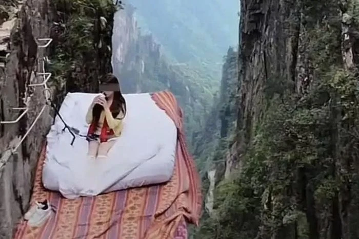 Trong kỳ nghỉ lễ Quốc tế Lao động (1/5), điểm check-in mang tên "vách đá cao 1.600 m" tại một khu danh thắng ở tỉnh Hồ Nam (Trung Quốc) thu hút sự chú ý với mô hình giường đặt sát mép vách đá dựng đứng. Theo Sohu , hình ảnh và video lan truyền trên mạng xã hội cho thấy chiếc giường có chăn, gối và dây an toàn, du khách tạo dáng như đang "ngủ lơ lửng" giữa không trung.