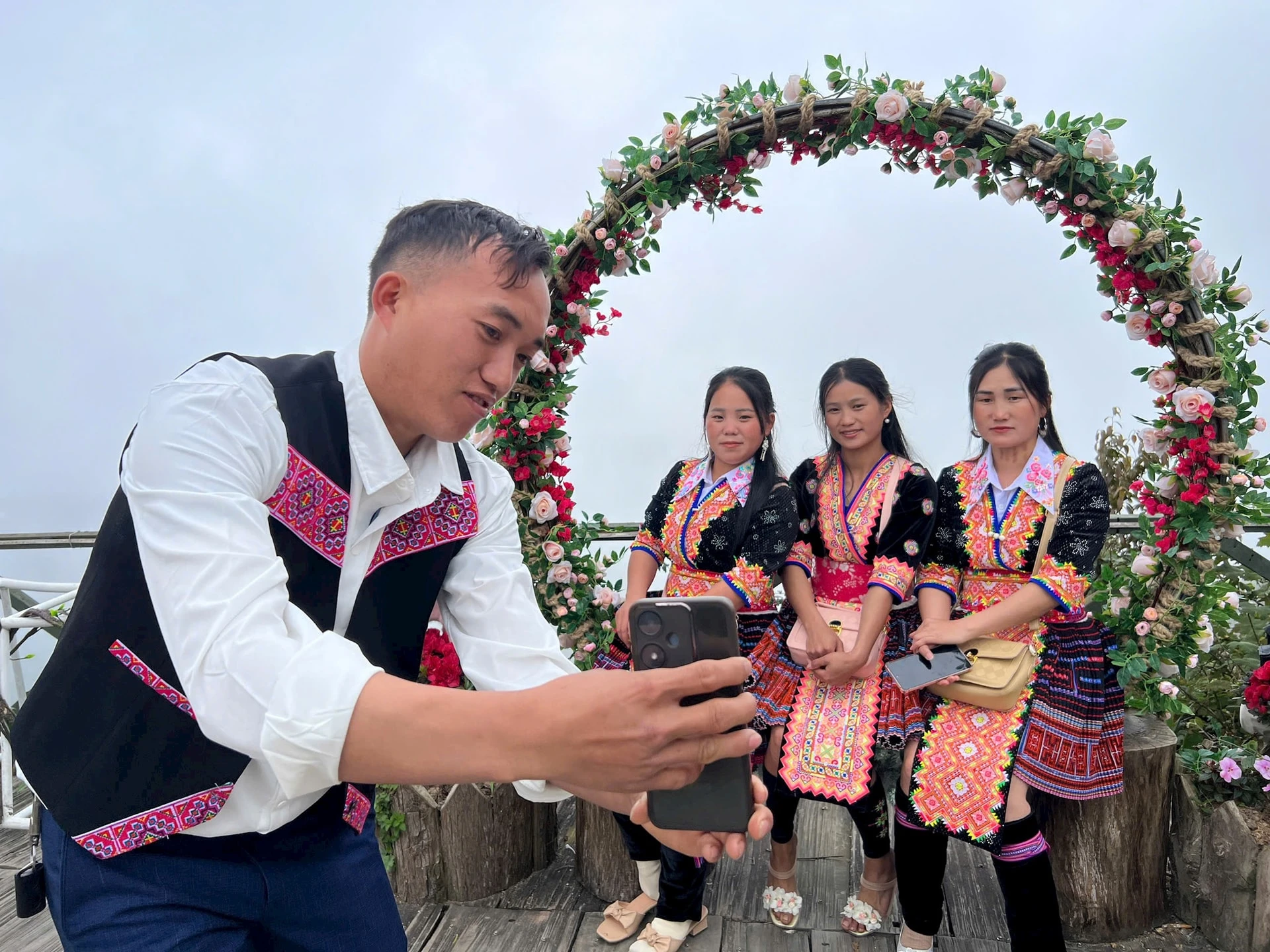 Anh Lò Văn Ly cùng vợ Khứ Thị Lầu (ở bản Nà Hung, xã Bình Lư, tỉnh Lai Châu) cùng bạn bè du xuân trên “cổng trời” Ô Quy Hồ. Ảnh: Bảo Hân