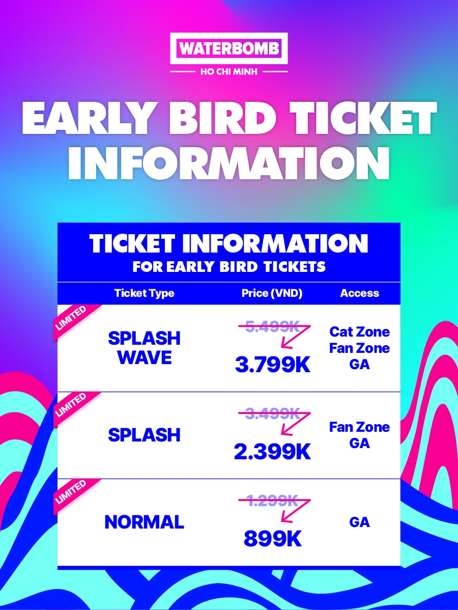 Vừa mới đây, BTC đã tung ra chương trình giảm giá 31% giá vé Early Bird, giúp khán giả – đặc biệt là những bạn trẻ hạn chế về mặt kinh tế – có thể tiếp cận dễ dàng hơn tới đại WATERBOM Hồ Chí Minh 2025 . 3 hạng vé là GA (General Area), Splash và Splash Wave lần lượt có mức giá ưu đãi là 899 nghìn đồng, 2.399 triệu đồng và 3.799 triệu đồng. So với giá thành gốc, đây là số tiền hợp lý để có vị trí đẹp và thuận tiện nhất với nhu cầu người xem.