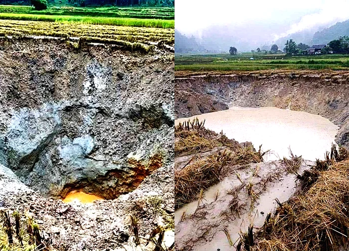 Một hố sụt lún rộng khoảng 100m, sâu hơn 10m, xuất hiện giữa cánh đồng ở Tuyên Quang. Lực lượng chức năng đã lập rào chắn, khuyến cáo người dân không lại gần khu vực này.