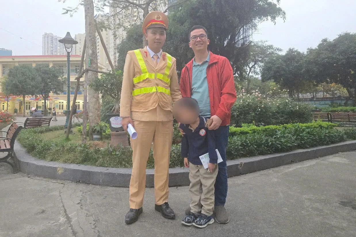 Phát hiện bé trai đi lạc gần bốt cảnh sát giao thông, thiếu tá Vũ Trung Đức, Đội Cảnh sát giao thông (CSGT) đường bộ số 6, đã kiểm tra thông tin, chở bé quay lại trường học chờ bố đến đón về.