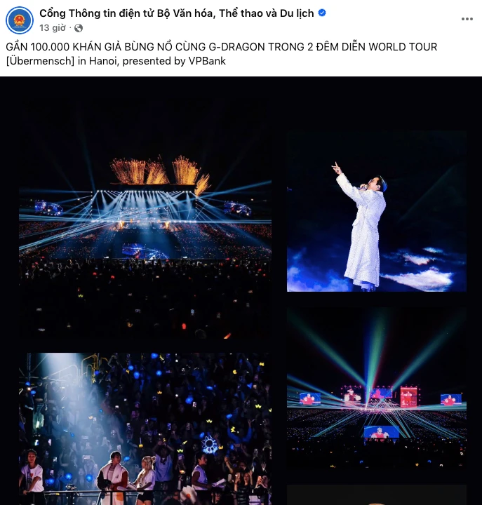 Dòng trạng thái của trang Cổng Thông tin điện tử Bộ Văn hoá, Thể thao và Du lịch xác nhận: “GẦN 100.000 KHÁN GIẢ BÙNG NỔ CÙNG G-DRAGON TRONG 2 ĐÊM DIỄN WORLD TOUR [bermensch] IN HANOI, presented by VPBank”.