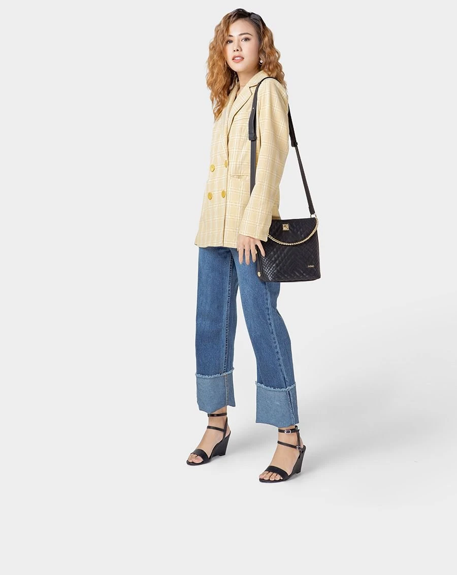 Kết hợp với áo blazer rộng họa tiết ca rô màu vàng kem nhẹ nhàng, quần jeans ống đứng xắn gấu bản lớn. Tổng thể trang phục vừa hiện đại vừa cổ điển, được hoàn thiện bằng chiếc túi xách đeo chéo màu đen.