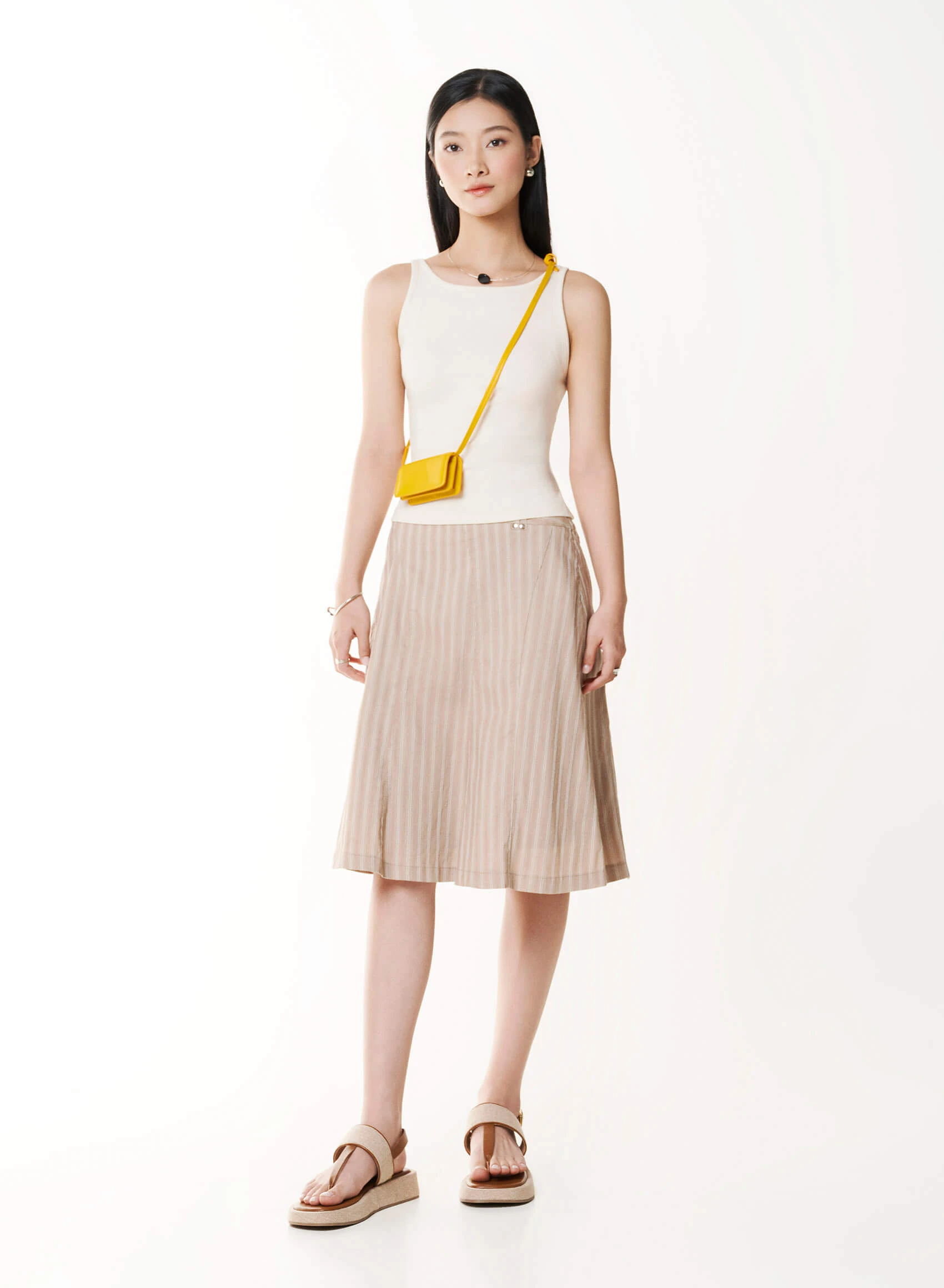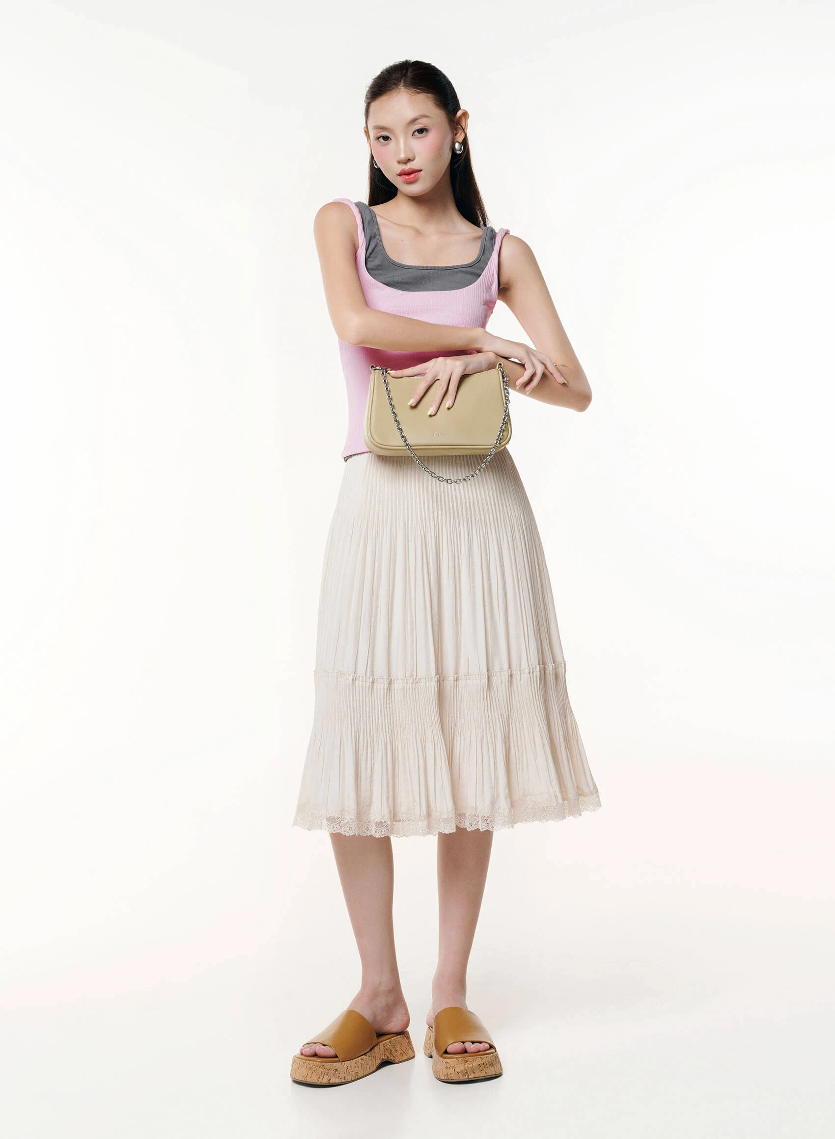 Nàng xuất hiện với đôi dép đế xuồng màu nâu nhạt, quai da màu caramel, toát lên vẻ ngoài dịu dàng và nữ tính. Phong cách layer tinh tế với hai lớp áo hai dây màu hồng và xám, kết hợp cùng chân váy midi xếp ly màu kem nhạt viền ren nhẹ, mang lại tổng thể tối giản mà vẫn tràn đầy sức sống.