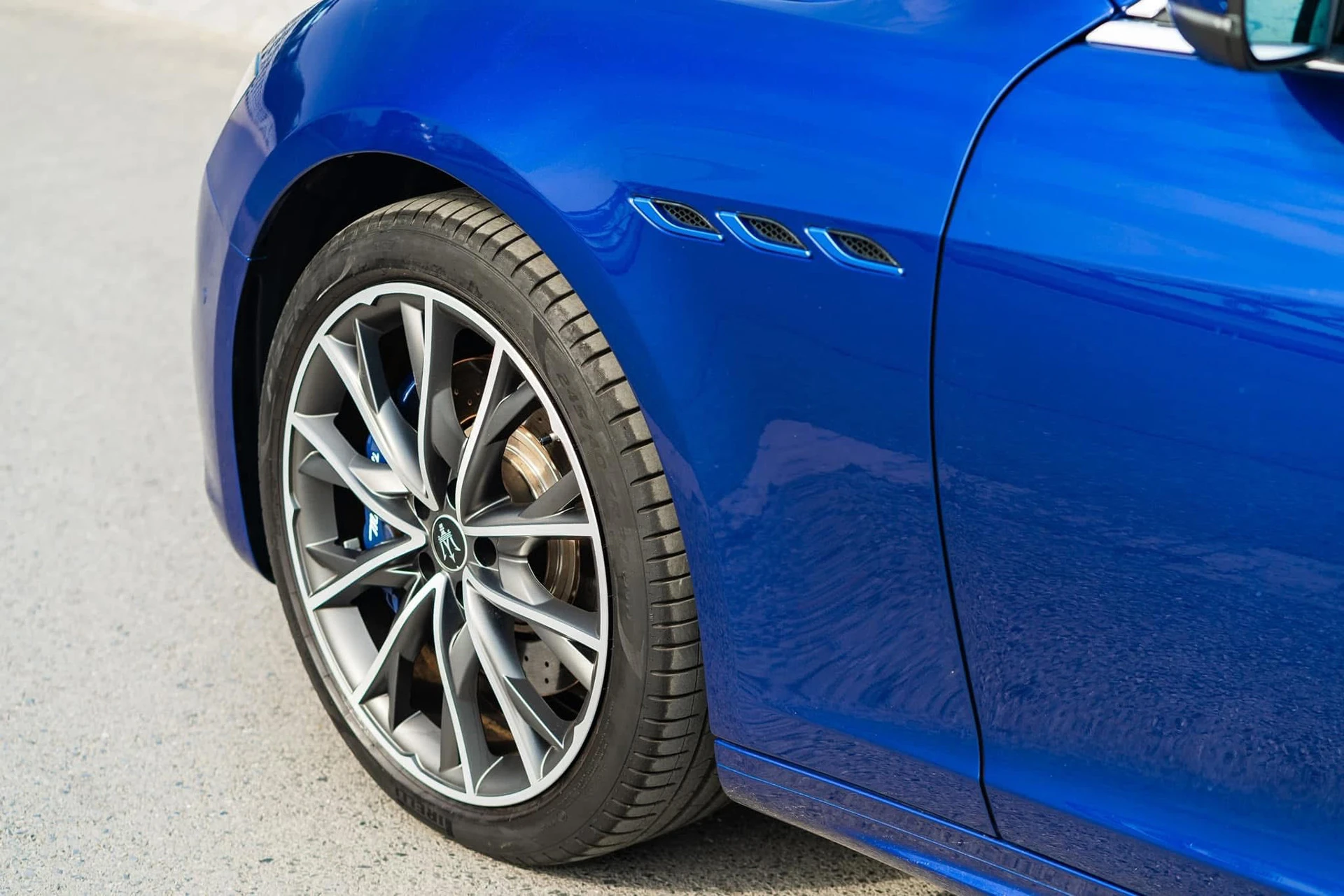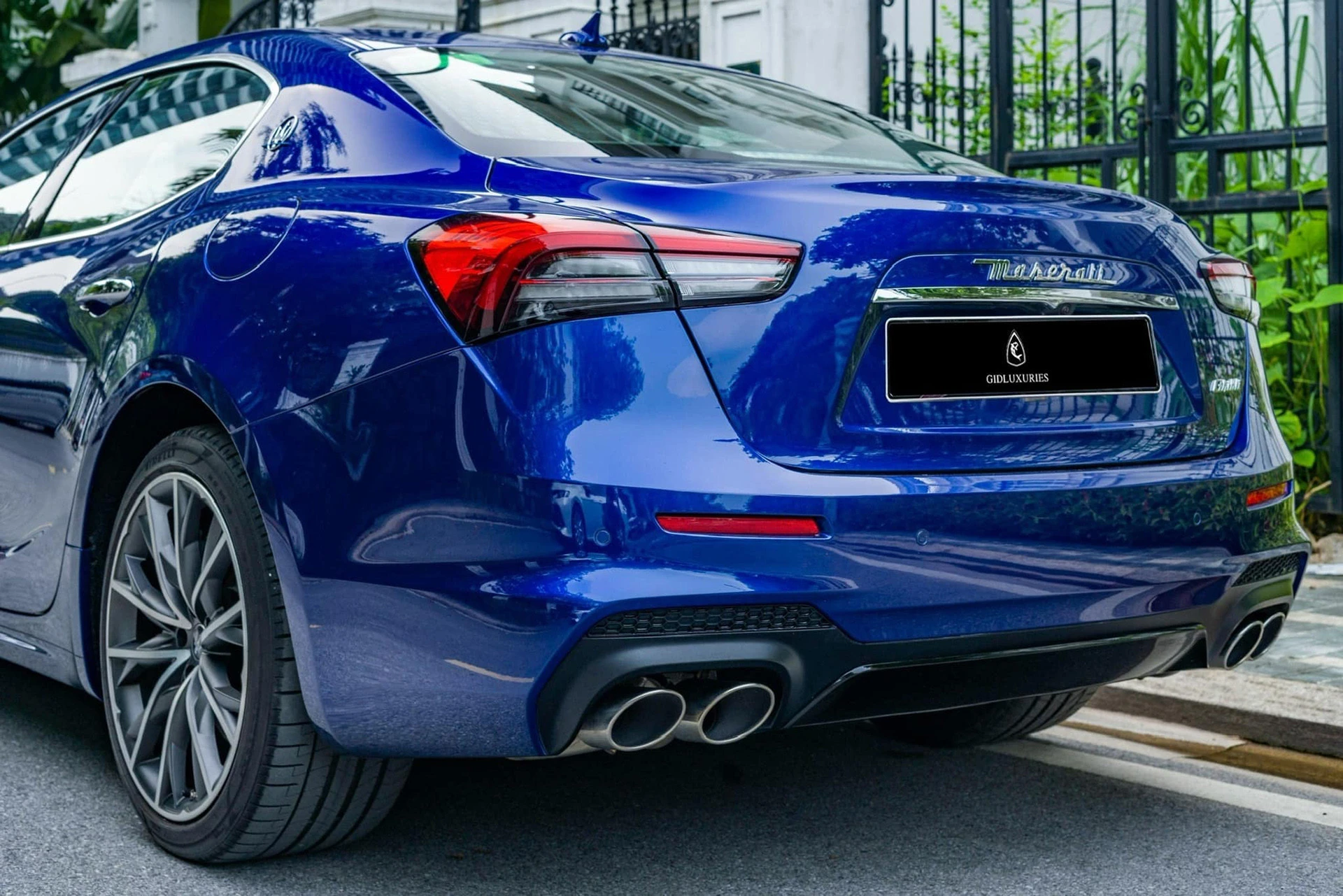 Chiếc Maserati Ghibli Hybrid này có ngoại thất sơn màu xanh dương với tên gọi Blu Emozione Metallic . Riêng tùy chọn này có giá không dưới 70 triệu đồng. Về cơ bản, do ít sử dụng và được chăm sóc cẩn thận, nước sơn xe còn khá mới. Một số chi tiết như mặt ca-lăng, ốp hốc gió, líp cản trước,… đều sơn đen nhằm tăng vẻ thể thao .