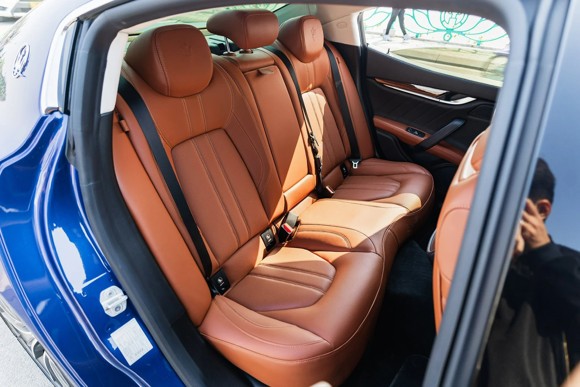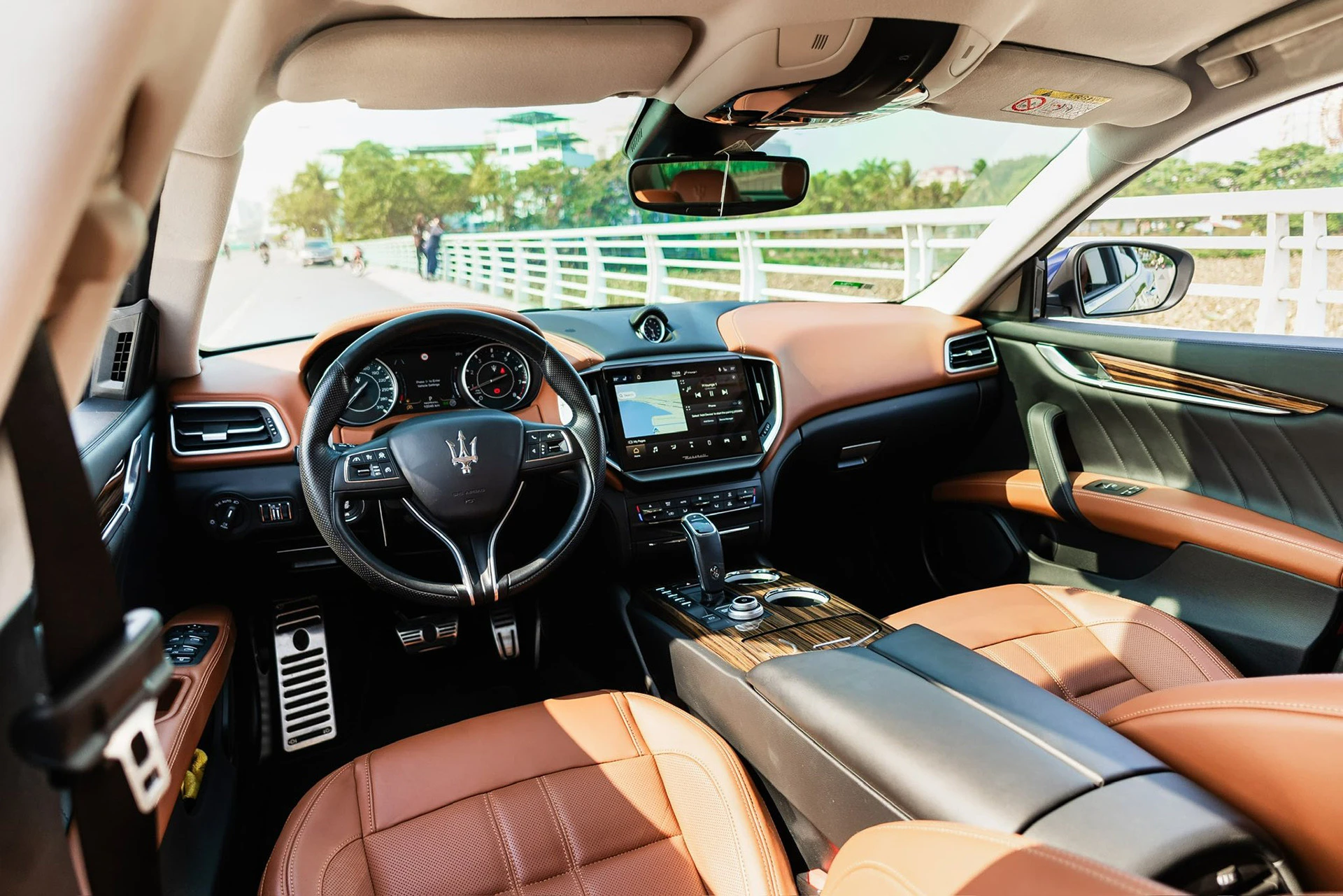 Nội thất chiếc Maserati Ghibli 2021 bọc da màu nâu chủ đạo. Với quãng đường lăn bánh chỉ vỏn vẹn khoảng 5.000 km/năm, ghế ngồi của xe chưa xuất hiện các vết nhăn và độ căng của da tương tự xe mới. Những chi tiết ốp gỗ trang trí thậm chí không có vết xước nhỏ.