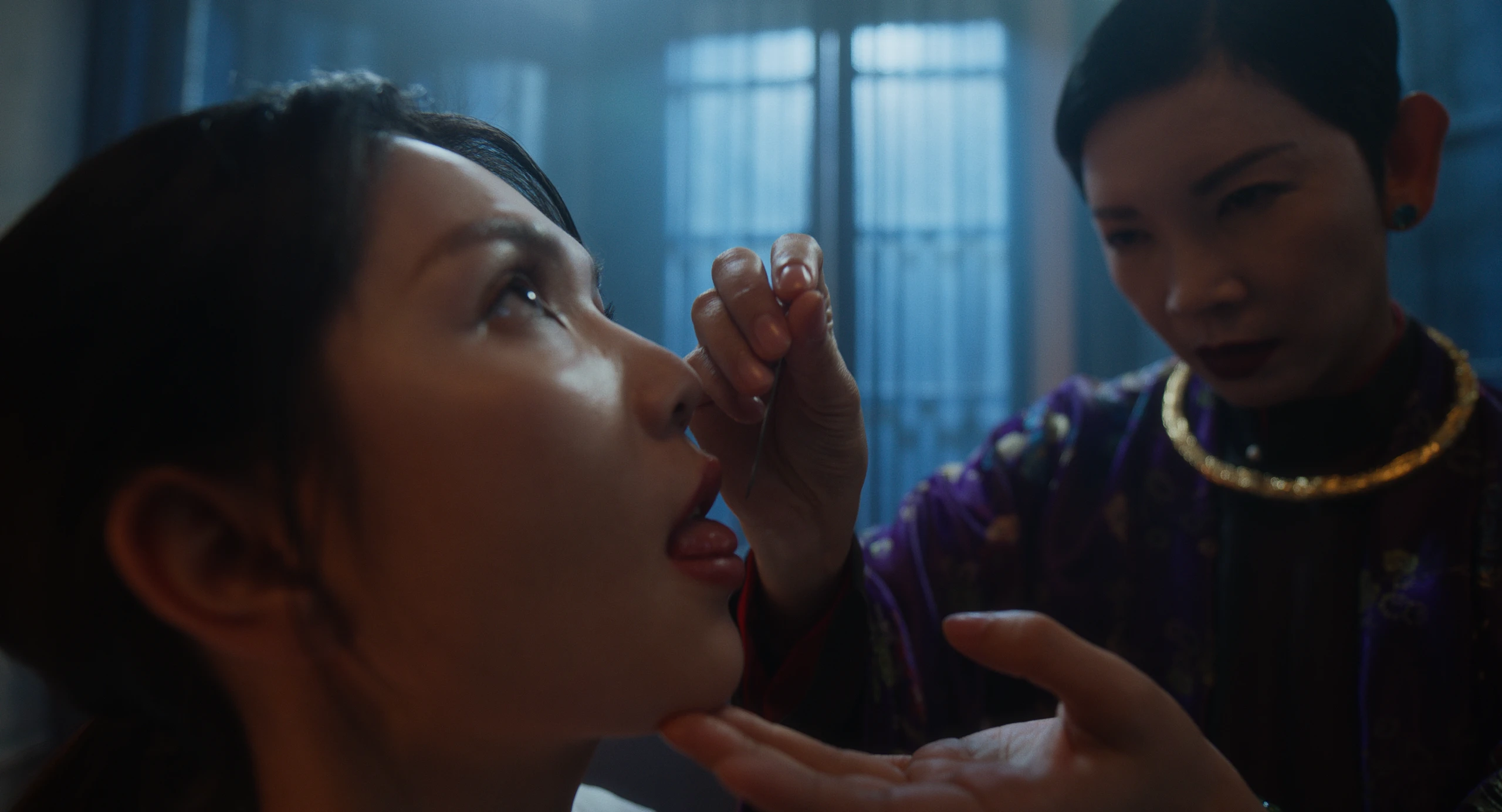 Trong bức ảnh, bà Xuân dí sát dao mổ sắc nhọn vào cổ một phụ nữ bị bịt mắt nằm trên giường phẫu thuật, trong khi nữ chính Thanh (Ngọc Trinh) chứng kiến cảnh tượng với vẻ mặt đầy căng thẳng.