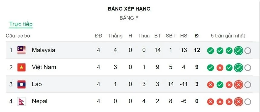 Lý do là bởi, sau loạt trận ngày 14/10, Malaysia thắng Lào 5-1 còn Việt Nam thắng 1-0 trước Nepal. Sau 4 lượt, tấm vé tới VCK Asian Cup 2027 ở bảng F chỉ còn là cuộc cạnh tranh của Việt Nam với Malaysia.
